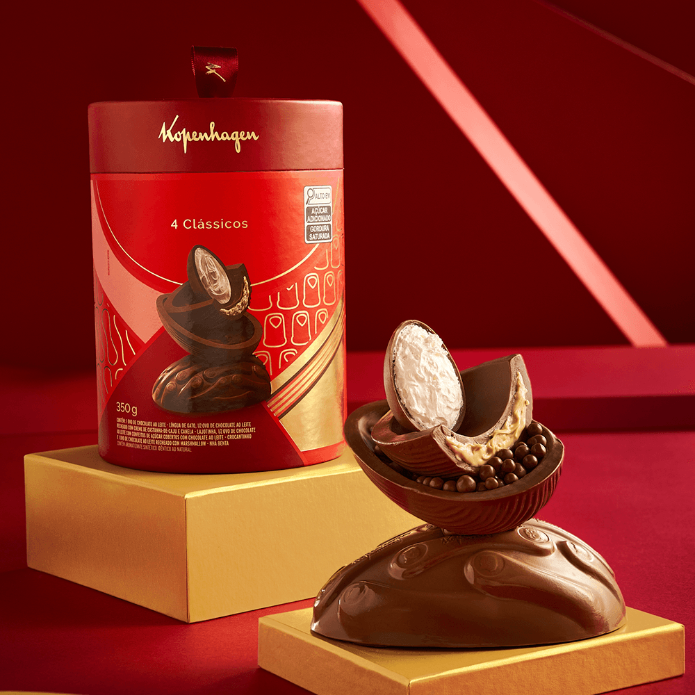 Um único produto que reúne, em uma só experiência, os ícones mais amados da Kopenhagen, trazendo combinações que despertam memórias e criam novos momentos de prazer. Contém 1 Ovo Língua de Gato, ½ Ovo Lajotinha, ½ Ovo Crocantinho e 1 Ovo Nhá Benta.