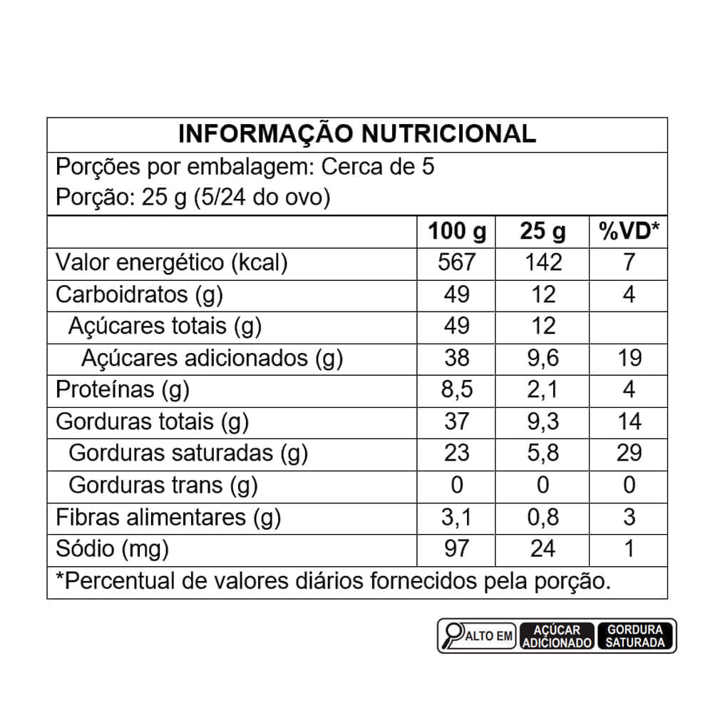 açúcar, leite em pó integral, manteiga de cacau, pasta de cacau, emulsificante lecitina de soja e aromatizante. ALÉRGICOS: CONTÉM DERIVADOS DE LEITE E SOJA. PODE CONTER AMENDOIM, AMÊNDOA, AVEIA, AVELÃS, CASTANHAS, CASTANHA-DE-CAJU, CASTANHA-DO-BRASIL, CENTEIO, CEVADA, MACADÂMIAS, NOZES, OVOS, PECÃS, PINOLI, PISTACHES E TRIGO. CONTÉM LACTOSE. CONTÉM GLÚTEN. -