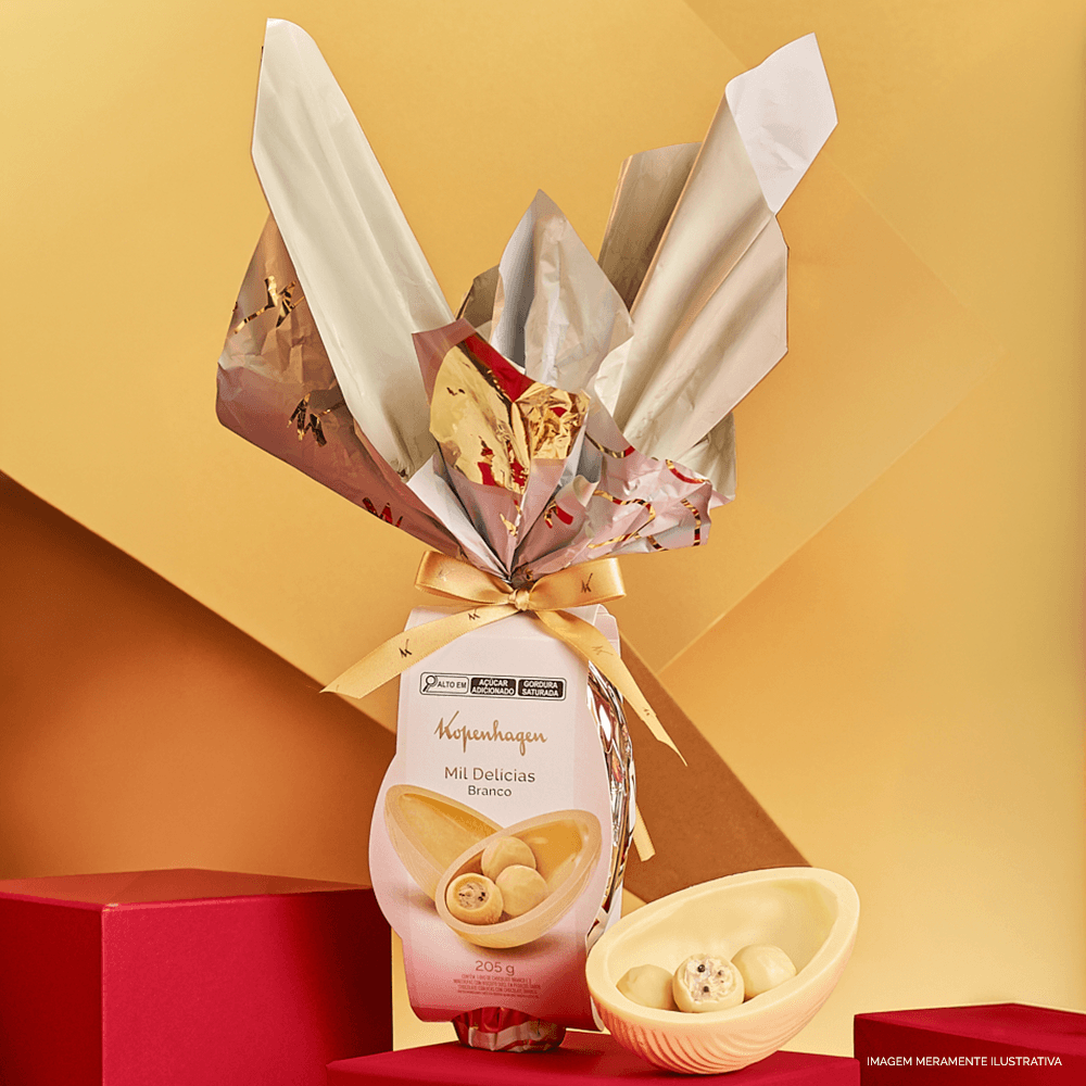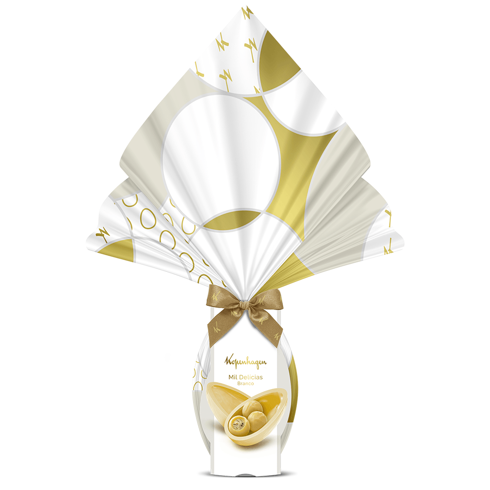 O melhor chocolate branco Kopenhagen em uma clássica versão em ovo de páscoa, que derrete na boca, recheado com 3 Mil Delícias. Perfeito para presentear, sem erro!