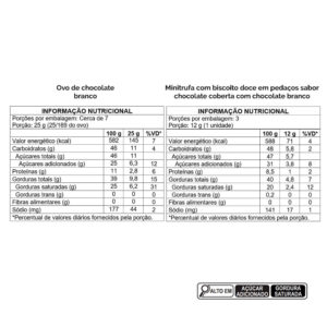 • Ovo de chocolate branco Ingredientes: leite em pó integral, manteiga de cacau, açúcar, soro de leite em pó parcialmente desmineralizado, emulsificante lecitina de soja e aromatizante. ALÉRGICOS: CONTÉM DERIVADOS DE LEITE E SOJA. PODE CONTER AMENDOIM, AMÊNDOA, AVELÃS, CASTANHA-DE-CAJU, CASTANHA-DO-BRASIL, MACADÂMIAS, NOZES E PISTACHES. CONTÉM LACTOSE. NÃO CONTÉM GLÚTEN. • Minitrufa com biscoito doce em pedaços sabor chocolate coberta com chocolate branco Ingredientes: açúcar, leite em pó integral, gordura vegetal, manteiga de cacau, soro de leite em pó parcialmente desmineralizado, creme de leite em pó, biscoito doce em pedaços sabor chocolate, emulsificantes: lecitina de soja e triestearato de sorbitana e aromatizantes. ALÉRGICOS: CONTÉM DERIVADOS DE LEITE E SOJA. PODE CONTER AMENDOIM, AMÊNDOA, AVELÃS, CASTANHA-DE-CAJU, CASTANHA-DO-BRASIL, MACADÂMIAS, NOZES E PISTACHES. CONTÉM LACTOSE. NÃO CONTÉM GLÚTEN. -