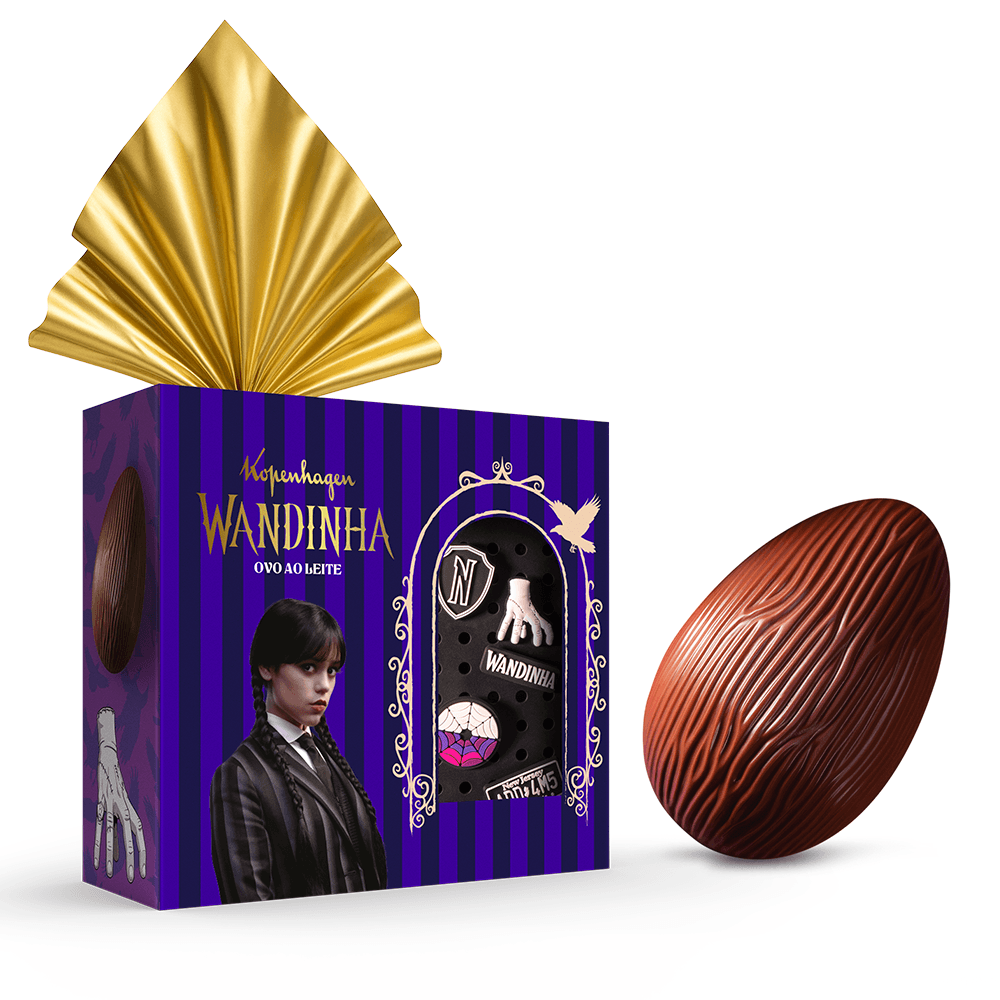 O universo de Wandinha chega à Páscoa com o clássico chocolate ao leite Kopenhagen. O ovo acompanha uma bolsinha exclusiva e muito fofa, além de 5 pins colecionáveis, perfeitos para personalizar mochilas, roupas ou acessórios. Um presente criativo e cheio de estilo, ideal para fãs da personagem e para tornar a Páscoa ainda mais divertida e única.