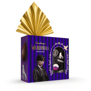 CONTÉM: 1 Ovo de chocolate ao leite e 1 Bolsa com pins Wandinha. -