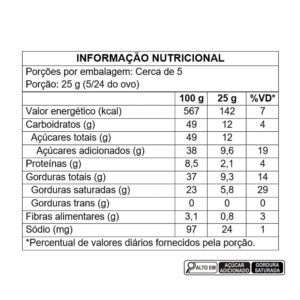 açúcar, leite em pó integral, manteiga de cacau, pasta de cacau, emulsificante lecitina de soja e aromatizante. ALÉRGICOS: CONTÉM DERIVADOS DE LEITE E SOJA. PODE CONTER AMENDOIM, AMÊNDOA, AVEIA, AVELÃS, CASTANHAS, CASTANHA-DE-CAJU, CASTANHA-DO-BRASIL, CENTEIO, CEVADA, MACADÂMIAS, NOZES, OVOS, PECÃS, PINOLI, PISTACHES E TRIGO. CONTÉM LACTOSE. CONTÉM GLÚTEN. -